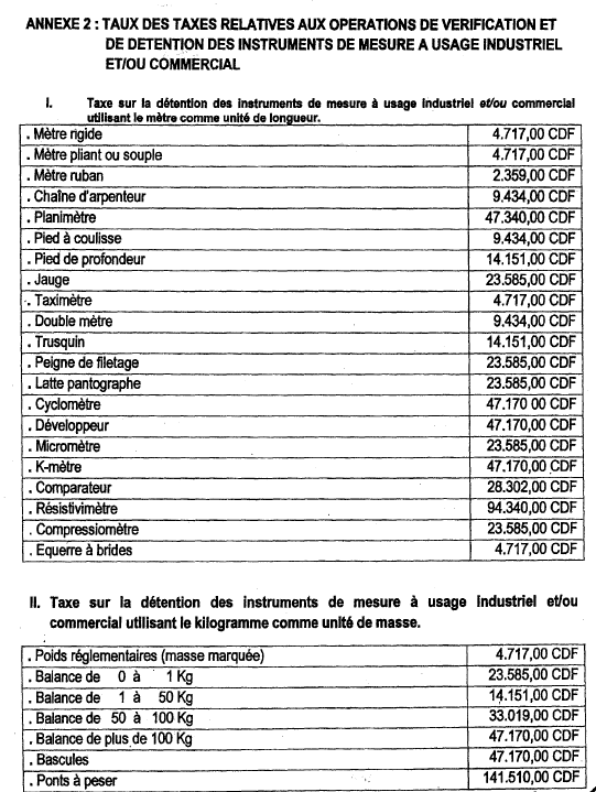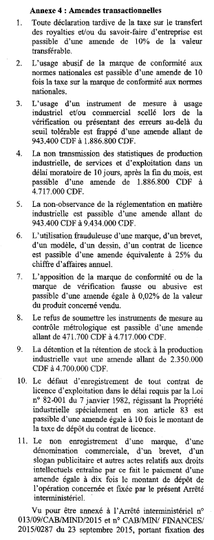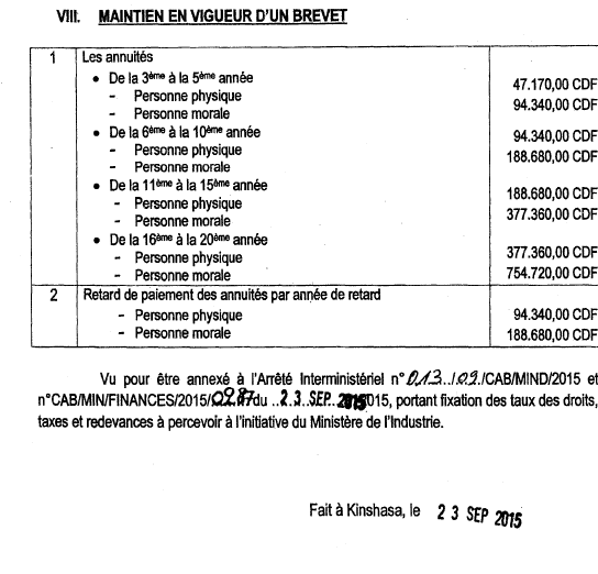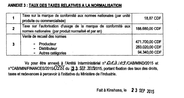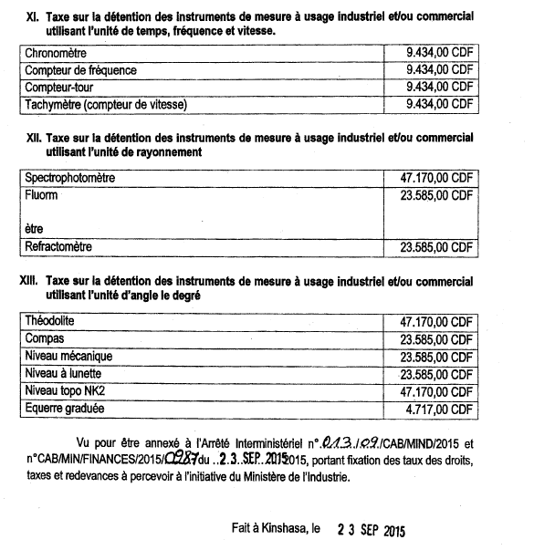 Arrêté interministériel n°013/09/CAB/MIND/2015 et n°CAB/MIN/FINANCES/2015/0287 du 23 septembre 2015, portant fixation des taux des droits, taxes et redevances à percevoir à l'initiative du Ministère de l'Industrie.