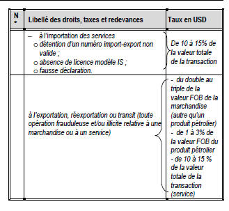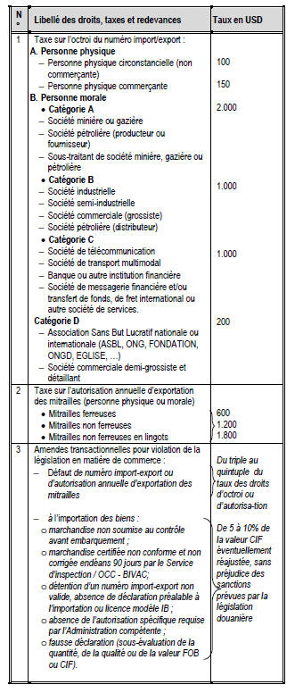 Les taux des droits, taxes et redevances à percevoir à linitiative du Ministère du Commerce Extérieur sont fixés en Dollar américain (USD), payables en Franc congolais au taux officiel du jour, suivant le tableau ci- dessous :