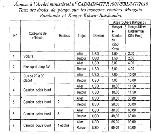 Il est institué des droits de péage pour tout véhicule empruntant l'axe routier Kenge - Kikwit -Batshamba, dans la Province du Bandundu.