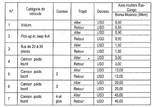 Ministère des infrastructures, Travaux publics et Reconstruction Arrêté ministériel n° CAB/MIN-ITPR/003/FBL/MT/2010 du 09 février 2010 portant fixation des droits de péage sur l'axe routier Boma - Moanda. Le Ministre des Infrastructures, Travaux publics et Reconstruction, Vu la Constitution de la République; Vu la Loi n° 08/006 du 07 juillet 2008 portant création d'un Fonds National d'Entretien Routier, en sigle « FONER» ; Vu le Décret n° 08/027 du 24 décembre 2008 portant création d'un Etablissement public dénommé Fonds National d'Entretien Routier, en sigle « FONER» ; Vu l’ordonnance n° 08/067 du 26 octobre portant nomination des Vice-Premiers Ministres, Ministres et Vice-ministres ; Vu l'Ordonnance n° 71/078 du 26 mars 1971 portant classification des routes en République Démocratique du Congo; Vu l’Ordonnance n° 08/73 du 24 décembre 2008 portant organisation et fonctionnement du Gouvernement, modalités pratiques de collaboration entre le Président de la République et le Gouvernement ainsi qu'entre les membres du Gouvernement, spécialement en son article 19 ; Vu l'Ordonnance n° 08/74 du 24 novembre 2008· fixant les attributions des Ministères; Attendu que l'entretien, la maintenance des routes d'intérêt général ainsi que l'organisation du péage sont de la compétence du Gouvernement central; Vu l'Arrêté interministériel n° 09/CAB/MIN- ITPR/002/KM/2009 du 06 mars 2009, n° CAB/FINANCES/DTS/2009 du 06 mars 2009, n° 001/CAB/MIN/ECONAT/&COM/2009 du 06 mars 2009 et 409/CAB/MIN/TVC/2009 du 06 mars 2009, portant fixation des taux, montants et modalités de perception des ressources du Fonds National d'Entretien Routier, en sigle FONER» spécialement en ses articles 13, 14, 15, 16 et 17; Vu l'impérieuse nécessité d'assurer l'entretien permanent et ordonné dudit axe; Vu la nécessité et l'urgence; ARRETE Article 1 : Il est institué des droits de péage pour tout véhicule empruntant l'axe routier Boma-. Moanda dans la Province du Bas-Congo. Article 2: Les taux de péage sur les tronçons routiers dudit axe sont fixés par catégorie des véhicules conformément au tableau repris en annexe du présent Arrêté. Article 3 : Sont exemptés du paiement des droits de péage: 1. les ambulances et les véhicules de lutte contre l'incendie; 2. les véhicules faisant des corbillards; 3. les véhicules de l'administration des Ponts et Chaussées et chaussées et. des. Services publics ayant la construction et l'entretien dans leur objet; 4. les véhicules militaires et de la Police nationale; 5. les véhicules de toute entreprise de génie civil ayant activité directe sur la-route concernée; 6. les véhicules officiels ; 7. les cyclomoteurs et les vélos. Article 4 : Toutes les dispositions antérieures et contraires au présent Arrêté sont abrogées. Article 5: Le Directeur général du Fonds National d'Entretien Routier est chargé de l'exécution du présent Arrêté qui entre en vigueur à la date de sa signature. Fait à Kinshasa, le 09 février 2010 Pierre Lumbi Okongo.