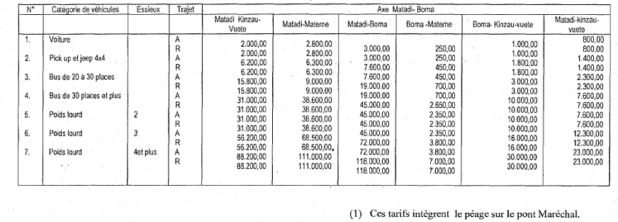 Ministère des Infrastructures, Travaux publics et Reconstruction Arrêté ministériel n° CAB/MIN-ITPR 004/MT/2010 du 09 février 2010 portant fixation des droits de péage sur l'axe routier Matadi-Boma Le Ministre des Infrastructures, Travaux publics et Reconstruction, Vu la Constitution de la République; Vu la Loi n° 08/006 du 07 juillet 2008 portant création d'un Fonds National d'Entretien Routier, en sigle «FONER» ; Vu l'Ordonnance n° 08/067 du 26 octobre portant nomination des Vice-Premiers Ministres, Ministres et Vice-ministres; Vu l'Ordonnance n° 7l/078 du 26 mars 1971 portant classification des routes en République Démocratique du Congo; Vu l'Ordonnance n° 08/73 du 24 décembre 2008 portant organisation et fonctionnement du Gouvernement, modalités pratiques de collaboration entre le Président de la République et le Gouvernement ainsi qu'entre les membres du Gouvernement, spécialement en son article 19 ; Vu l'Ordonnance n° 08/74 du 24 novembre 2008 fixant les attributions des Ministères; Vu le Décret n° 08/27 du 24 décembre 2008 portant création et statut d'un Etablissement public dénommé Fonds National d'Entretien Routier, en sigle « FONER » ; Attendu que l'entretien, la maintenance des routes d'intérêt général ainsi que l'organisation du péage sont de la compétence du Gouvernement central ; Vu l'Arrêté interministériel n° 09/CAB/MIN- ITPR/002/KM/2009 du 06 mars 2009, n° CAB/FINANCES/DTS/2009 du 06 mars 2009, n° 001/CAB/MIN/ECONAT/&COM/2009 du 06 mars 2009 et 409/CAB/MIN/TVC/2009 du 06 mars 2009, portant fixation des taux, montants et modalités de perception des ressources du Fonds National d'Entretien Routier, en sigle FONER» spécialement en ses articles 13, 14, 15, 16 et 17; Considérant que le pont Maréchal et ses voies d'accès font partie intégrante de la route nationale n°1 ; Etant donné que les droits de péage existent sur le pont Maréchal; Attendu que l'axe Boma Matadi exige du Gouvernement de la République des travaux d'entretien; Vu l'impérieuse nécessité d'assurer l'entretien permanent et ordonné dudit axe ; Vu la nécessité et l'urgence ; ARRETE Article 1 : Il est institué des droits de péage pour tout véhicule empruntant l'axe Boma-Matadi Article 2 : Les taux de péage sur l'axe routier Borna-Matadi intégrant ceux effectués sur le pont Maréchal, sont fixés par catégorie des véhicules conformément au tableau repris en annexe du présent Arrêté. Article 3 : Sont exemptés du paiement des droits de péage: 1. les ambulances et les véhicules de lutte contre l'incendie; 2. les véhicules faisant des corbillards ; 3. les véhicules de l'administration des Ponts et Chaussées et des 'Services publics ayant la construction et l'entretien dans leur objet; 4. les véhicules militaires et de la Police nationale; 5. les véhicules de toute entreprise de génie civil ayant activité directe sur la route concernée; 6. les véhicules officiels; 7. les cyclomoteurs et les vélos. Article 4: Toutes les dispositions- antérieures et contraires au présent arrêté sont abrogées. Article 5 : Le Directeur général du Fonds National d'Entretien Routier est chargé de l'exécution du présent Arrêté qui entre en vigueur à la date de sa signature. Fait à Kinshasa, le 09 février 2010 Pierre Lumbi Okongo. Annexe 1 en Francs congolais