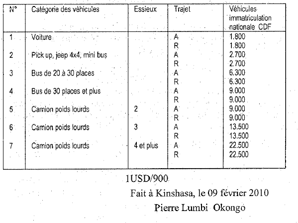Il est institué des droits de péage pour tout véhicule empruntant l'axe routier de la RN3 Bukavu-Hombo.