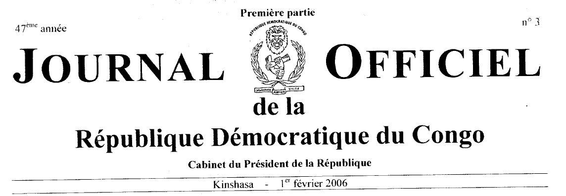 SOMMAIRE GOUVERNEMENT Ministère de la Justice 05 janvier 2004 - Arrêté ministériel n° 554/CAB/MIN/J/2004 accordant la personnalité juridique à l'association sans but lucratif non confessionnelle dénommée « les Foyers d'Aide aux Prisonniers» en sigle « F.A.P. ». col. 4. 24 septembre 2005 - Arrêté ministériel n° 879/CAB/MIN/J/2005 accordant la personnalité juridique à l'association sans but lucratif confessionnelle dénommée « Eglise la Persévérance en Jésus-Christ au Congo» en sigle «E.PER.CO», col. 5. 05 octobre 2005 - Arrêté ministériel n° 887/CAB/MIN/J/200S accordant la personnalité juridique à l'association sans but lucratif non confessionnelle dénommée « Association des Femmes Sourdes du Congo» en sigle « AFSC », col. 6. 13 décembre 2005 - Arrêté ministériel n° 9l3/CAB/MIN/J/2005 approuvant la nomination des personnes chargées de l'administration ou de la direction de l'association sans but lucratif confessionnelle dénommée « ECC/15 ieme Communauté Baptiste du Congo» en sigle « ECC15 ième C.B.CO », col. 8. 29 décembre 2005 - Arrêté ministériel n° 923/CAB/MIN/J/2005 accordant la personnalité juridique à l'association sans but lucratif non confessionnelle dénommée « Solidarité des Anciennes Elèves de la Compagnie de Marie Notre Dame d'Afrique » en sigle « S.E.CO.M.A. », col. 9. 29 décembre 2005 - Arrêté ministériel n° 932/CAB/MIN/J/2005 accordant la personnalité juridique à l'association sans but lucratif non confessionnelle dénommée « Centre pour Handicapés Heri Kwetu » sigle « CH.H.K. » asbl, col.11. 31 décembre 2005 - Arrêté ministériel n° 939/CAB/MIN/J/2005 approuvant les modifications des statuts et la nomination de la personne chargée de l'administration ou de la direction de l'association sans but lucratif dénommée « Ordre des Frères Mineurs Capucins », col. 12. 31 décembre 2005 - Arrêté ministériel n° 941/CAB/MIN/J/2005 accordant la personnalité juridique à l'association sans but lucratif non confessionnelle dénommée « Association des Commerçants de Kisangani » en sigle « A.C.KIS », col. 13. 31 décembre 2005 - Arrêté ministériel n° 952/CAB/MIN/J/2005 accordant la personnalité juridique à l'association sans but lucratif non confessionnelle dénommée « Conseil-Information- Formation Santé» sigle « CIF SANTE », col. 14. 31 décembre 2005 - Arrêté ministériel n° 954/CAB/MIN/J/200S accordant la personnalité juridique à l'association sans but lucratif non confessionnelle dénommée « Regroupement des Commerçants de Kato et son Extension » en sigle « R.C.K.E. ASBL.». col. 15. 31 décembre 2005 - Arrêté ministériel n° 955/CAB/MIN/J/2005 accordant la personnalité juridique à l'association sans but lucratif non confessionnelle dénommée « Groupe Scolaire Tshiteku-Kasaka-La Fontaine-Royale et Collège St. Gilbert» en sigle « G.S.T.K. ». col. 16. 31 décembre 2005 - Arrêté ministériel n° 956/CAB/MIN/J/2005 accordant la personnalité juridique à l'association sans but lucratif non confessionnelle dénommée « Actions Communautaires pour la Réinsertion Socio-économique des Groupes Vulnérables »en sigle « ACRESEV », col. 17. 31 décembre 2005 - Arrêté ministériel n° 961/CAB/MIN/J/2005 accordant la personnalité juridique à l'association sans but lucratif non confessionnelle dénommée « La Voix Sans Bouche» en sigle « V.S.B », col. 19. 03 janvier 2006 - Arrêté ministériel n° 968/CAB/MIN/J/2005 approuvant les modifications apportées aux statuts et la nomination de la personne chargée de l'administration ou de la direction de l'association sans but lucratif confessionnelle dénommée « 28eme Communauté Méthodiste Unie au Congo Central », col. 20. 31 décembre 2005 - Arrêté ministériel n° 970/CAB/MIN/J/200S accordant la personnalité juridique à l'association sans but lucratif non confessionnelle dénommée « Susila Dharma Congo Démocratique» en sigle « S.D.C.O », col. 21. 31 décembre 2005 - Arrêté ministériel n° 971/CAB/MIN/J/2005 accordant la personnalité juridique à l'association sans but lucratif non confessionnelle dénommée « Union des Femmes Violées. Veuves et Enfants Orphelins Victimes de la Guerre» en sigle « UFEVEOVIG», col. 23. 31 décembre 2005 - Arrêté ministériel n° 977/CAB/MIN/J/200S accordant la personnalité juridique à l'association sans but lucratif non confessionnelle dénommée « Centre Evangélique de Révélation Alpha et Omega» en sigle «C.E.R.A.O H. » col. 24. 31 décembre 2005 - Arrêté ministériel n° 979/CAB/MINIJ/2005 accordant la personnalité juridique à rétablissement d'utilité publique dénommée « Fondation Galilée-Congo» en sigle « F.G.C », col. 25. 31 décembre 2005 - Arrêté ministériel n° 980/CAB/MIN/J/2005 accordant la personnalité juridique à l'association sans but lucratif non confessionnelle dénommée «Institut Panafricain de Santé Communautaire-Médecine Tropicale» en sigle « LP.A.S.C-M.T. H. » col. 27. 31 décembre 2005 - Arrêté ministériel n° 983/CAB/MIN/J/2005 accordant la personnalité juridique à l'association sans but lucratif confessionnelle dénommée «Eglise la Sagesse de Dieu 1) en sigle « E.S.D. ». col. 28. 31 décembre 2005 - Arrêté ministériel n° 984/CAB/MIN/J/2005 approuvant la nomination des personnes chargées de l'administration ou de la direction de l'association sans but lucratif confessionnelle dénommée « Communauté des Eglises Chrétiennes en Afrique H en sigle « ECC/40eme CECA H. col. 29 COURS ET TRIBUNAUX ACTES DE PROCEDURE Ville de Kinshasa RPA. 17.285 - Notification d'appel et citation à comparaître 1. Madame Lukadi Kapinga 2. Monsieur Franc Milumba, col. 31. R.C. 5137/5146 - Notification de date d'audience - Madame Yumba Nzau. col. 31. R.C. 87051 - Notification de date d'audience 1. Monsieur Jean Luc Mabondzot 2. Monsieur Marc Gimond 3. Société Grands Hôtels du Congo, col. 32. RAC. 1 