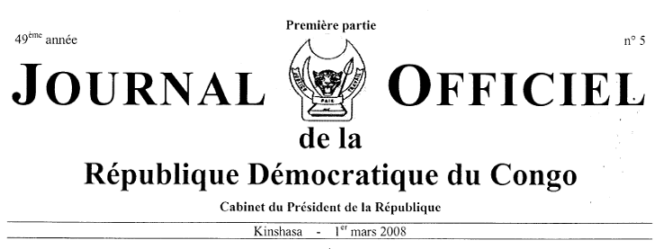 SOMMAIRE PRESIDENCE DE LA REPUBLIQUE 28 février 2008 - Ordonnance n°08/018 portant nomination du Coordonnateur National du Programme National de Sécurisation, Pacification, Stabilisation et Reconstruction des Provinces du Nord-Kivu et du Sud-Kivu, dénommé «Programme AMANI », col. 5. GOUVERNEMENT Ministère de la Justice 31 décembre 2005 - Arrêté ministériel n° 984/CAB/MIN/J/2005 approuvant la nomination des personnes chargées de l'administration ou de la Direction de l'association sans but lucratif confessionnelle dénommée « Communauté des Eglises Chrétiennes en Afrique» en sigle « ECC/40e CECA », col. 6. 01 novembre 2007 - Arrêté ministériel n°0293 CAB/MIN/J/2007 accordant la personnalité juridique à l'association sans but lucratif non confessionnelle dénommée « Les Amis de Martin Luther King, JR» en sigle « AMALUK », col.7. 05 novembre 2007 - Arrêté ministériel n° 0301/CAB/MIN/J/2007 accordant la personnalité juridique à l'association sans but lucratif non confessionnelle dénommée « Action Socio - Sanitaire pour le Développement Humain Durable» en sigle A.S.P.D. », col. 8. 07 novembre 2007 - Arrêté ministériel n° 0305/CAB/MIN/J&GS/ 2007 accordant la personnalité juridique à l'association sans but lucratif non confessionnelle dénommée « Le Club Allégra » en sigle « C.ALL. », col.10. 07 novembre 2007 - Arrêté ministériel n° 0309/CAB/MIN/J/2007 accordant la personnalité juridique à l'association sans but lucratif confessionnelle dénommée « Eglise Prophétique Libérale» en sigle « EPROLI », col.11. 07 novembre 2007 - Arrêté ministériel n° 0312/CAB/MIN/J/2007 accordant la personnalité juridique à l'association sans but lucratif non confessionnelle dénommée « Young Women' s Christian Association of Democratie Republic of Congo» en sigle « YWCA DR Congo» - « Union Chrétienne Féminine de la RD Congo ) en sigle U.C.F-RD Congo », col. 12. 09 novembre 2007 - Arrêté ministériel n° 0313/CAB/MIN/J&GS/ 2007 accordant la personnalité juridique à l'association sans but lucratif non confessionnelle dénommée « Association des Aspergeurs du Congo» en sigle «ASPCO », col. 13. 10 novembre 2007 - Arrêté ministériel n° 0321 /CAB/MIN/J/2007 accordant la personnalité juridique à l'association sans but lucratif non confessionnelle dénommée « Association des Femmes pour le Développement du Congo» en sigle « AFDC », col. 15. 06 mars 1997 - Décret n° 0018 accordant la personnalité civile à une association sans but lucratif dénommée « Eglise Evangélique de Réveil du Zaïre en sigle « E.E.R.Z », col. 16. Ministère de la Santé 04 juillet 2006 - Arrêté ministériel n° 1250/CAB/MIN/S/013/MC/2006 portant organisation et fonctionnement des services d'hygiène en République Démocratique du Congo, col. 17. 09 juillet 2006 - Arrêté ministériel n° 1250/CAB/MIN/S/022/MC/ 2006 portant nomenclature des actes médicaux et des prestations sanitaires fiscales de la Direction Nationale de l'Hygiène, col. 21. Ministère de l'Environnement, Conservation de la Nature et Tourisme, 12 février 2008 - Arrêté ministériel n° 052/CAB/MIN/ECNT/02/JEB/OS portant création de la cellule Environnement d'Appui Institutionnel au Ministre de l'Environnement, Conservation de la Nature et Tourisme, col. 23. Ministère des Affaires Foncières 06 novembre 2007 - Arrêté ministériel n° 149/CAB/MIN/AFF. FONC/SEC/PKM/2007 portant nomination d'un Chef de Bureau domaine de la circonscription foncière de Mont-Amba dans la Ville de Kinshasa, col. 25. 13 février 2008- Arrêté ministériel n° 010/CAB/MIN/AFF .FONC/2008 portant Création de la Circonscription foncière de Kabare-Sud/Walungu dans la Province du Sud Kivu, col. 26. 13 février 2008 - Arrêté ministériel n° 011/CAB/MIN/ AFF.FONC/2008 portant Création de la Circonscription foncière de Rutshuru dans la Province du Sud Kivu, col. 27. 13 février 2008 - Arrêté ministériel n° 012/CAB/MIN/AFF. FONC/2008 portant nomination des agents de Kabare/Sud-Walungu, Kalehe, Kamituga et Shabunda dans la Province du Sud Kivu, col. 27. 13 février 2008 - Arrêté ministériel n° 013/CAB/MIN/ AFF.FONC/200S portant nomination d'un cadre de commandement dans la Circonscription foncière de Kindu dans la Province du Maniema, col. 30. 13 février 2008 - Arrêté ministériel n°014/CAB/MIN/ AFF.FONC/2008 portant nomination des cadres de commandement dans la circonscription foncière de Rutshuru, col. 31. 16 février 2008 - Arrêté ministériel n° 018/CAB/MIN/ AFF.FONC/2008 Rapportant les Arrêtés ministériels n°s 016 et 017 du 02 février 2007 portant respectivement reprise au domaine privé de l'Etat de la portion de terre inculte d'une superficie de 10 ha 5 ares 91 ca de la concession n° s.u 4046 du plan cadastral de la Commune de Kanshi et création du lotissement dénommé Mindelebende comprenant 74 parcelles de terre à usage résidentiel du Plan cadastral de la Commune de Kanshi, Ville de Mbuji-Mayi dans la Province du Kasaï Oriental, col. 32. COURS ET TRIBUNAUX ACTES DE PROCEDURE Ville de Kinshasa R.P. 971 - Publication de l'extrait d'une requête en annulation - Maître Claude Manzila Lundum Sal'Asal, col. 33. R.P. 981 - Publication de l'extrait d'une requête en annulation - Madame Kankolongo Mbombo, col. 33. R.P. 982 - Publication de l'extrait d'une requête en annulation - Madame Epoluke Bombula Christine, col. 34. RC 3088 - Acte de signification d'un jugement - Monsieur Bitatu Makenda, col. 34. R.C 11674 - Signification du jugement - La société FADECO et Crts, col. 37. R.e. 99.225 - Signification d'un jugement - Monsieur le Bourgmestre de la Commune de la Gombe et Crts col. 40. R.e. 11.585 - Signification du jugement - Journal officiel de la RDC, col. 42. RP. 19.416/1 - Citation directe à domicile inconnu - Monsieur Mathod Manish et Crts, col. 44. R.P. 5902/III - Notification de date d'audience - Monsieur le DG du Journal officiel, col. 45. R.P. 18.